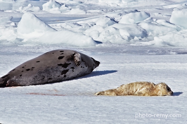 Phoque du Groenland (Phoca groenlandica). Jeune blanchon et adulte. Iles de la Madeleine